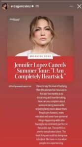 El pasado 31 de mayo, Jennifer Lopez confirmó la cancelación de su gira a través de su página web oficial, expresando su desolación por la decisión. «Estoy completamente desconsolada y devastada por haberlos decepcionado», declaró JLo, prometiendo compensar a sus fans en el futuro. Además, Live Nation, la promotora del tour, explicó que la cancelación se debió a que Jennifer necesitaba tiempo para estar con su familia y amigos cercanos, subrayando la importancia de su bienestar personal en estos momentos difíciles.