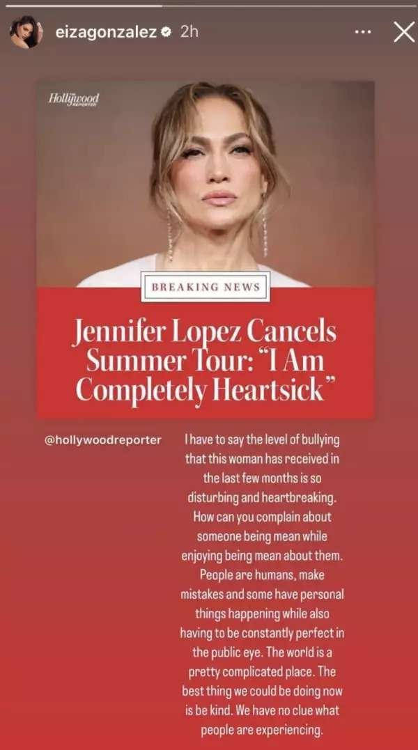La actriz mexicana Eiza González salió en defensa de su colega Jennifer Lopez, luego de que la ‘Diva del Bronx’ confirmara la cancelación de su esperada gira de verano, This Is Me… Live. En un emotivo mensaje publicado en sus redes sociales, Eiza expresó su preocupación por el acoso mediático al que ha sido sometida JLo, especialmente en medio de los rumores sobre una crisis en su relación con Ben Affleck.